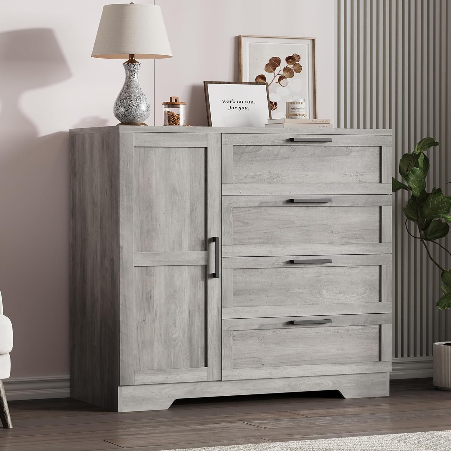 IDEALHOUSE 43.3'' H Armoire Wardrobe Closet with 4 Drawers and 2 Doors, Hanging Rod, Multifunctional Wooden Dresser with Storage Closet, Bathroom Cabinet for Bedroom, Gray