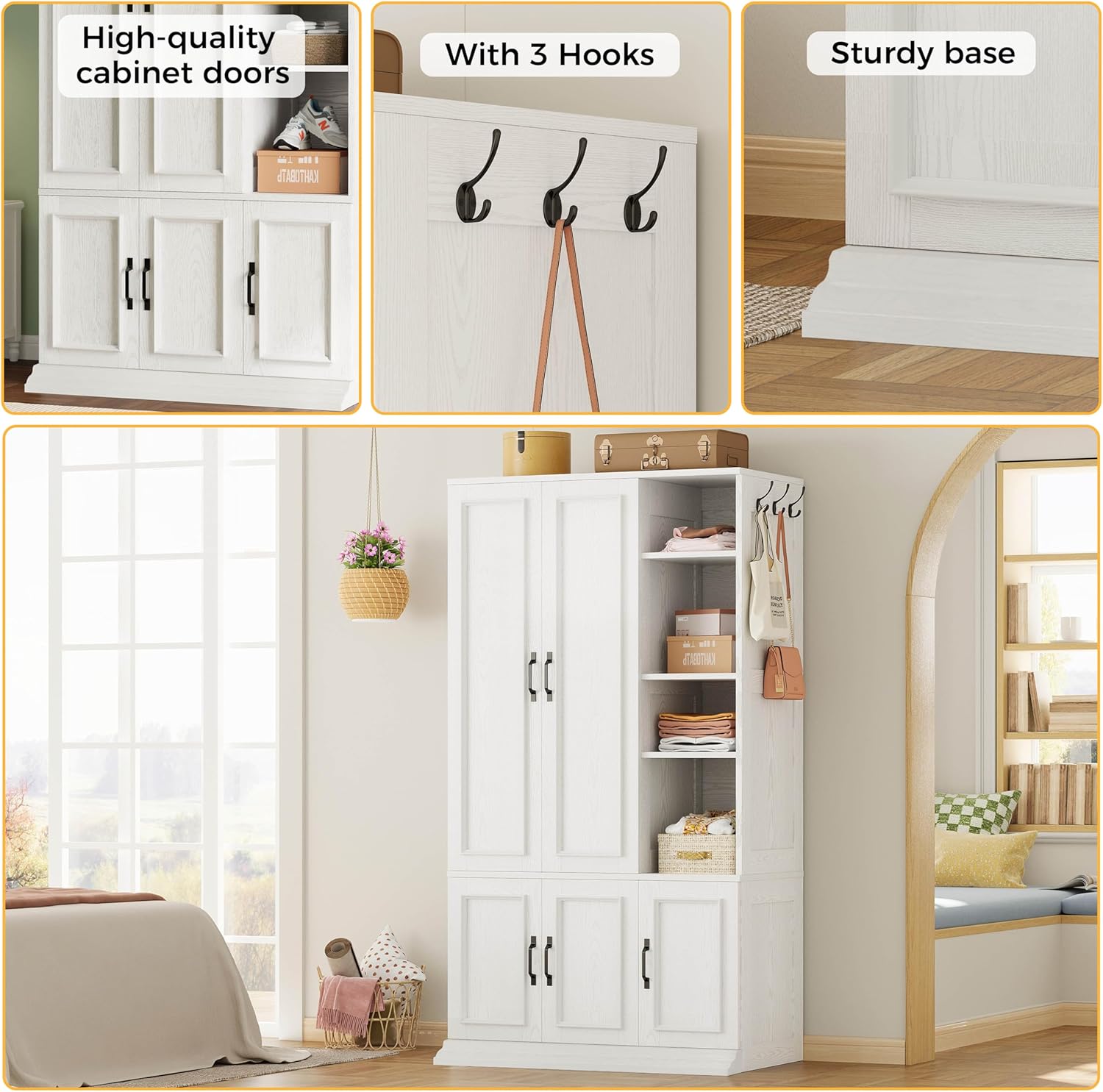 This durable armoire is measuring 70 inches high x 38 inches wide, it comes with 5 doors and 4 shelves with 3 hooks on the side, making it perfect for storing a variety of clothes, shoes, and accessories.