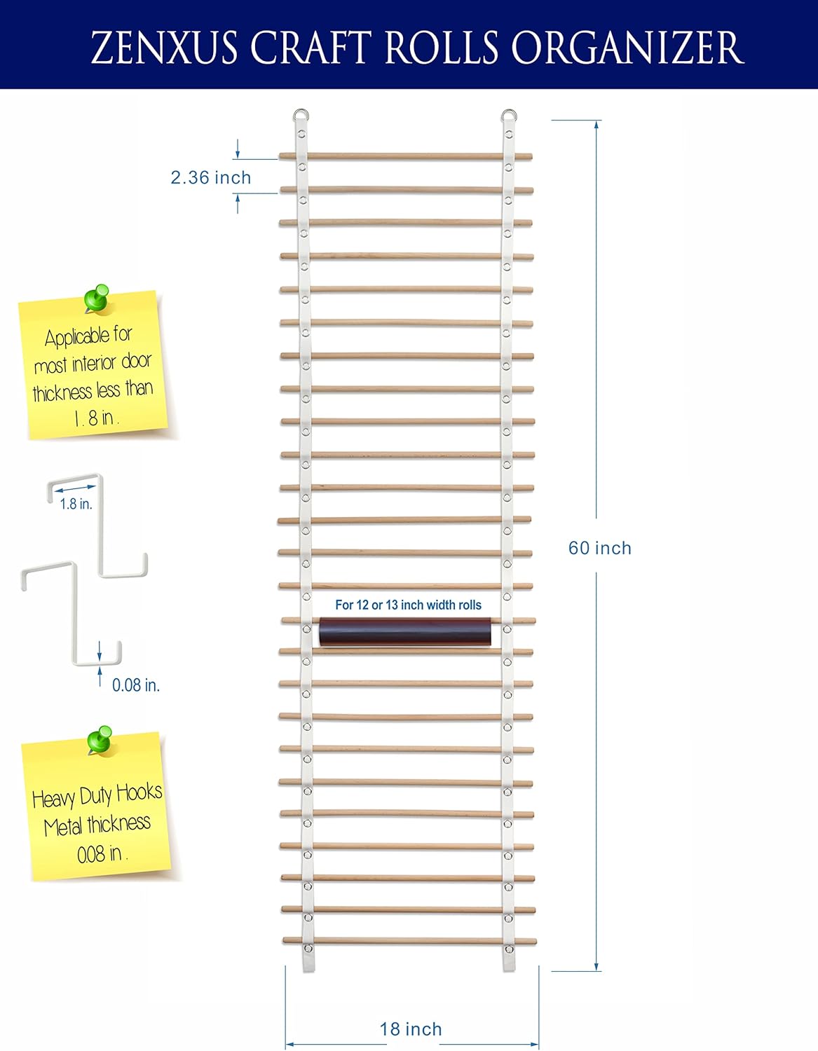 Vinyl Roll Holder, 25 Rolls, Craft Roll Storage and Organizer, Cotton Straps and Wood Dowels, with Door Hanging Hooks